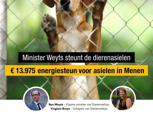 Vlaams Dierenminister Ben Weyts steunt dierenasielen in Menen met een eenmalige energiesteun van € 13.975. “Niet enkel gezinnen en bedrijven werden geconfronteerd met een fors gestegen energiefactuur”, zegt Weyts. “De dierenasielen krijgen nu een tegemoetkoming voor de hoge energieprijzen van de afgelopen maanden, zodat ze hun goede werk kunnen verderzetten.”